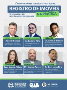 A Câmara Municipal de Chã Grande realiza, no próximo dia 13 de março, às 10h, o 1º Grande Painel Jurídico – Tudo sobre Registro de Imóveis na Prática. O evento acontecerá no plenário da Casa Legislativa e é aberto à participação da população.