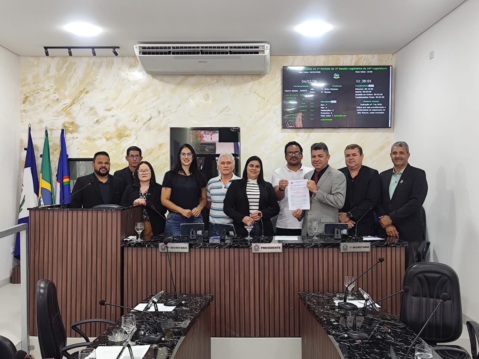 Na ordem do dia, o plenário aprovou por unanimidade, em segunda votação, o Projeto de Lei 01/2026, que institui o Dia da Marcha para Jesus em Chã Grande. Também foram aprovadas a indicação de Jardeson Carlos para a implantação de uma clínica de reabilitação para dependentes químicos e a indicação de Liviane Alexandre para a continuidade do calçamento no Sítio Mutuns.